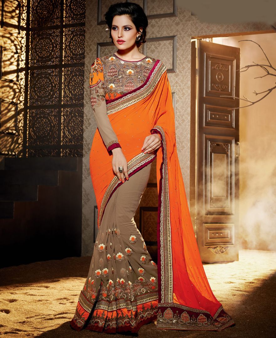 Orange & Brown Color Chiffon Designer Wedding Wear Sarees : Jasmit Collection OS-92855
