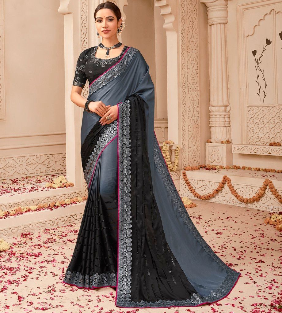 Grey & Black Color Raw Silk Designer Wedding Wear Sarees : Pakhudi Collection OS-91537