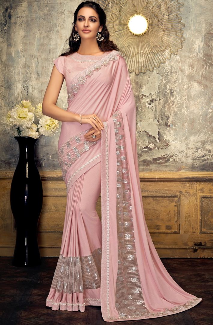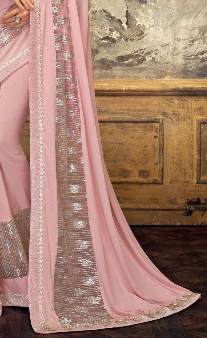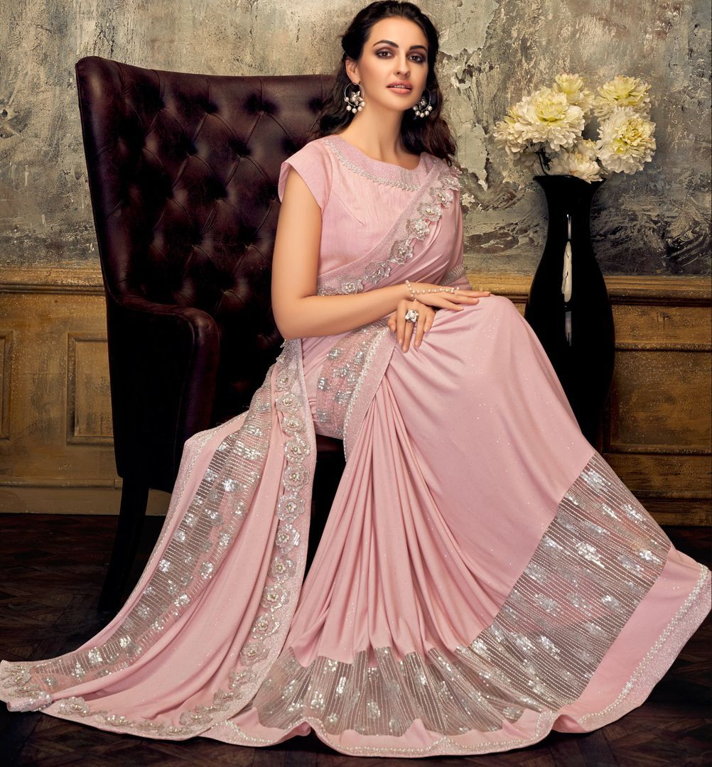 गुलाबी रंग हाफ लाइक्रा और हाफ फैंसी नेट ट्रेंडी पार्टी वियर साड़ी: कैरावित कलेक्शन OS-94392