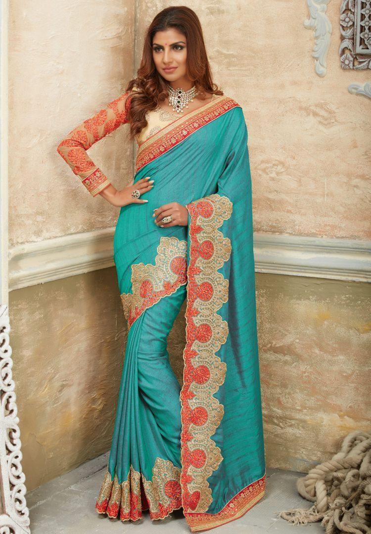 ఆక్వా బ్లూ కలర్ రా సిల్క్ డిజైనర్ బ్రైడల్ చీరలు : రూపాషి కలెక్షన్ OS-92891
